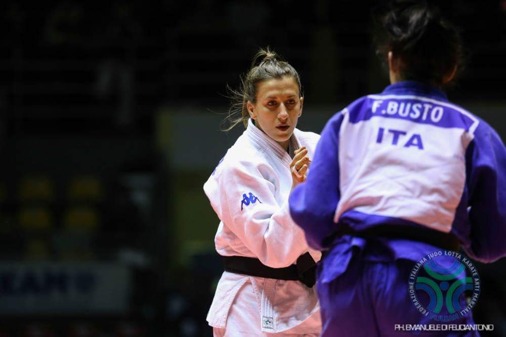 Nella stessa categoria Francesca Busto, supera i primi incontri, quando si trova avanti alla poliziotta Greci, gioca una nuova carta, la testa…e vince..ci hanno provato ma non ci sono riusciti! La semifinale é una formalità in attesa della finale contro Regis Alessia, ex Akiyama, incontro che si preannuncia ricco di emozioni, purtroppo l’atleta dei carabinieri si infortuna e Francesca conquista il titolo Assoluto, forse non sará stata la finale da sogno, ma gli infortuni fanno parte del gioco!