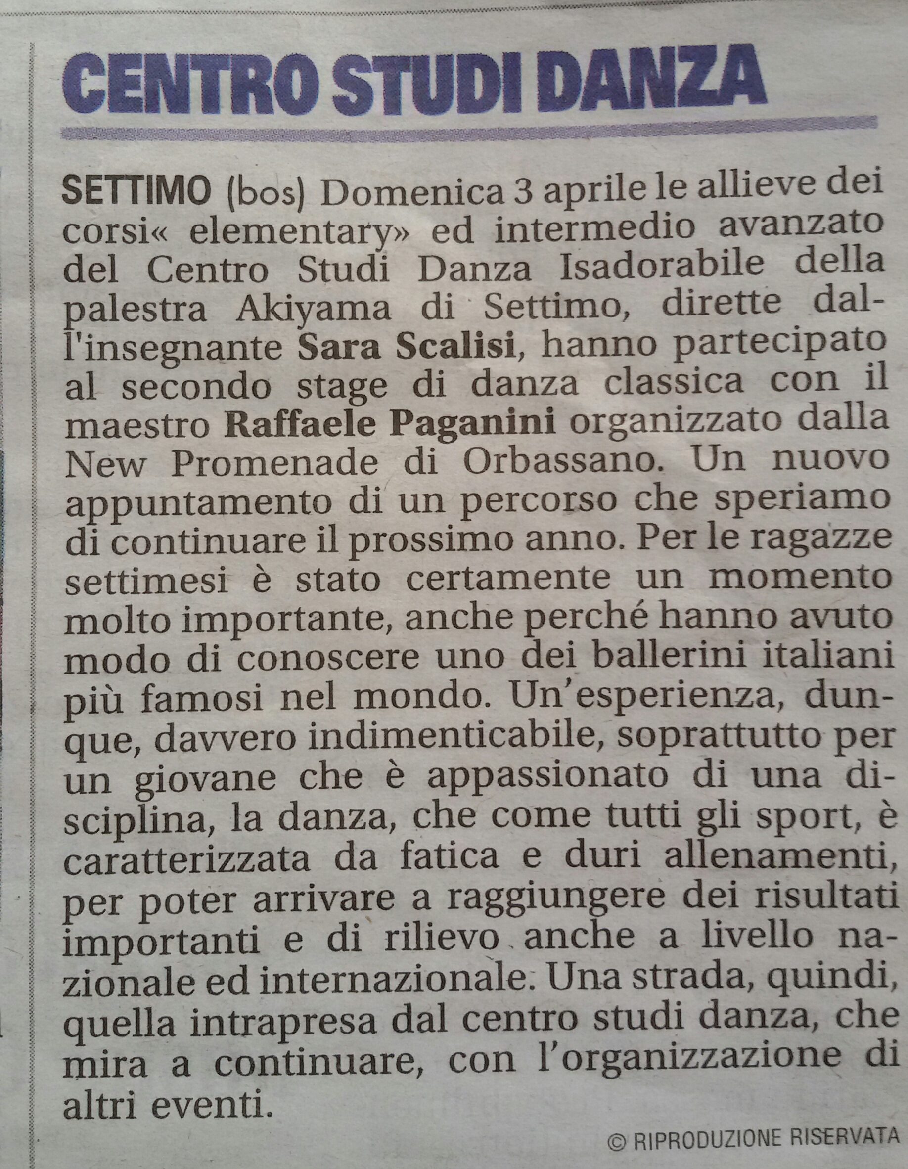 Danza Classica: secondo stage con il M° Paganinidi Akiyama Staffin Danzaon Pubblicato il 17 Aprile 2016 Domenica 3 aprile le danzatrici della palestra Akiyama Settimo hanno aggiunto un esperienza fondamentale per la loro crescita, di seguito l’articolo uscito sulla Nuova periferia.