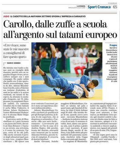 Ha iniziato con il judo a cinque anni su consiglio delle maestre, perché «ero un ragazzino troppo vivace, mi azzuffavo sempre con i miei compagni. Ho capito subito che quello era il mio sport». Scelta azzeccatissima, niente da dire. Adesso Massimiliano Carollo, nato a Palermo ma torinese d’adozione, di anni ne ha sedici e lo scorso weekend, sul tatami di Sarajevo, ha ottenuto la medaglia d’argento, nei 73 chilogrammi, ai campionati Europei cadetti. Un cammino trionfale che lo visto battere il serbo Milos Vukicevic, il lettone Arturs Kurbanovs, l’azero Mahammad Kuduzada e lo sloveno Matic Ovijac in semifinale.